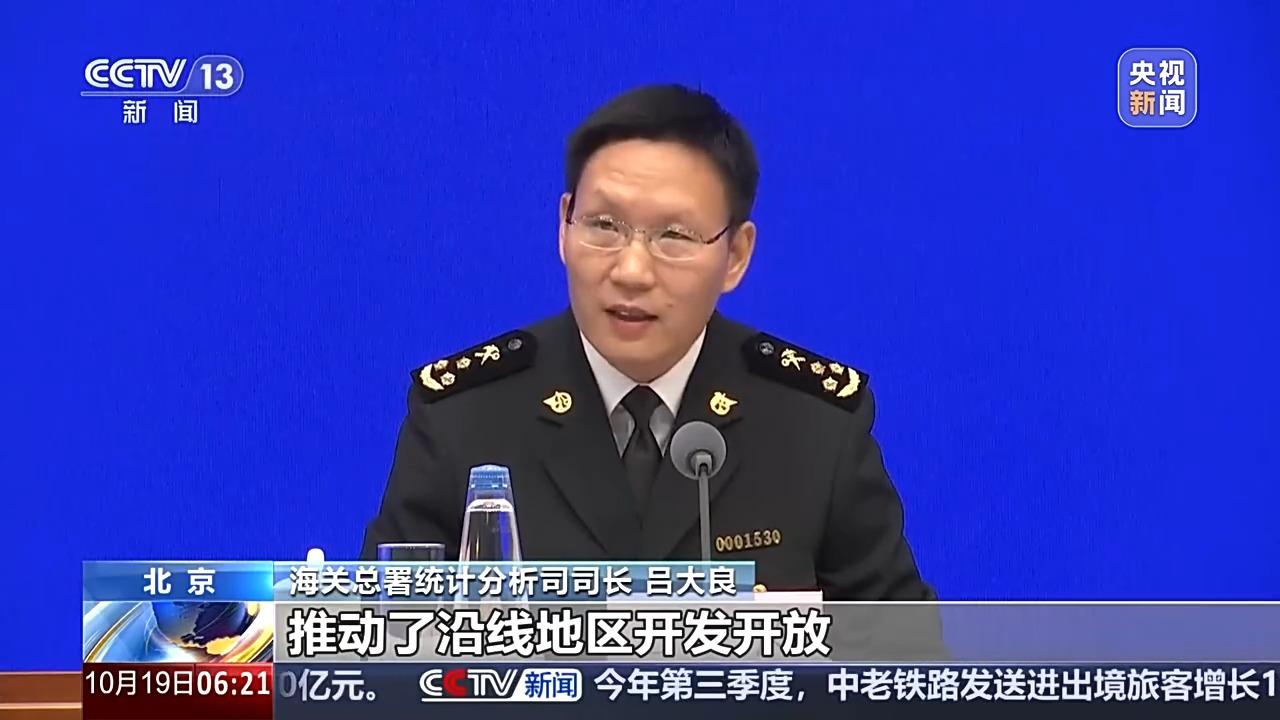 海关总署统计分析司司长 吕大良: 西部陆海新通道建设推动了沿线地区开发开放,前三季度,西部地区经过新通道进出口5137.9亿元,增长了15%。