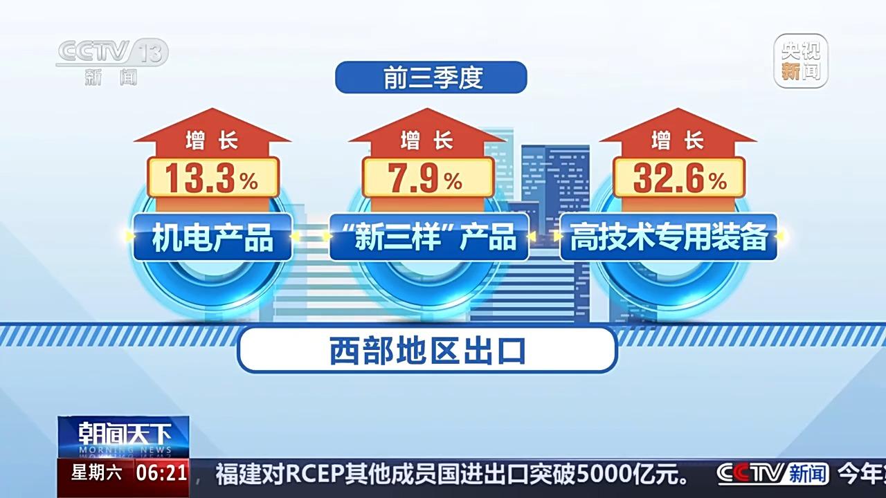 除了通过创新提速保障进出口量能增长,西部地区的外贸产业也持续提质升级。前三季度,西部地区出口机电产品、“新三样”产品、高技术专用装备出口分别增长13.3%、7.9%、32.6%。