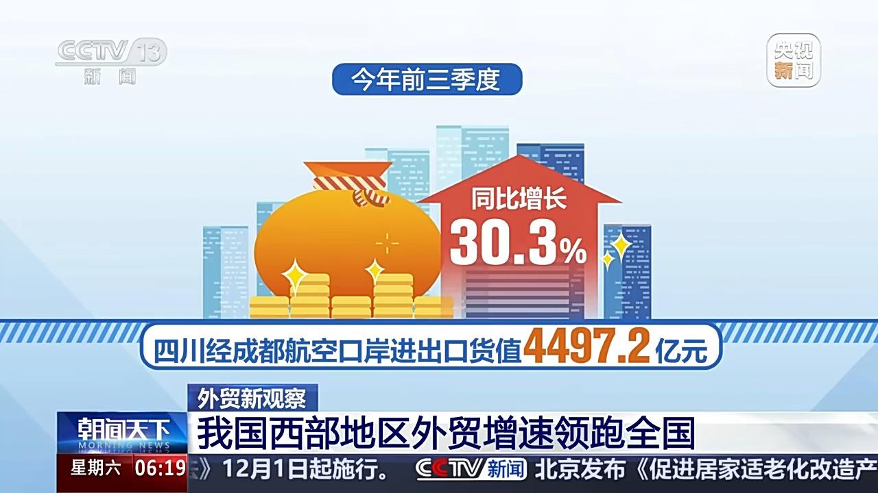 自2020年以来,年度进出口值突破3万亿元并向4万亿元迈进,年均增长8.5%。今年前三季度,西部地区外贸进出口增速高出全国整体3.6个百分点,占全国进出口总值的比重提升到9%。以西部地区外贸规模排名首位的四川为例,今年前三季度,四川经成都航空口岸进出口货值4497.2亿元,同比增长30.3%,仅次于上海、北京,占全国空运进出口总值的7.7%。