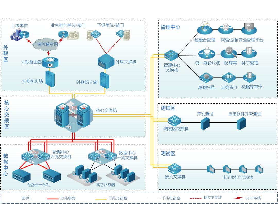 依据国家对于电子政务网的建设要求,同时考虑网络平台的高可靠、高可用、可扩展、统一管理等要求,思恒科技对于电子政务内网设计为两级扁平化结构、星型拓扑,由六个逻辑功能区域组成:核心交换区、数据中心、管理中心、测试区、外联区、局域网接入区。