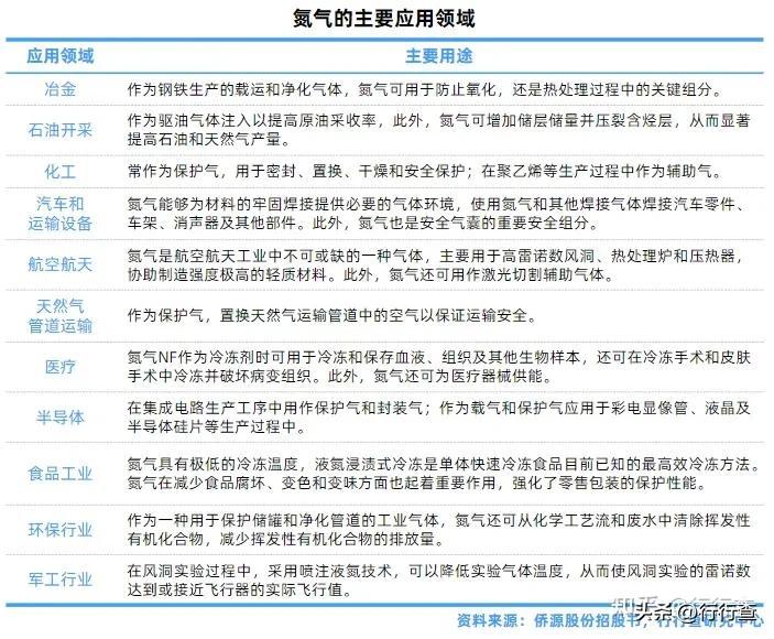 •氮气的应用领域:氮气化学性质较为稳定,在冶金、化工、电子信息、半导体、浮法玻璃、晶硅电池、磁性材料等工业生产中被用作保护气,在天然气管道输送中作为置换气。由于液态氮气温度非常低,在金属低温处理过程中应用广泛;氮气无毒无味,因此液氮也被用于食品冷冻及食品、药品的包装。