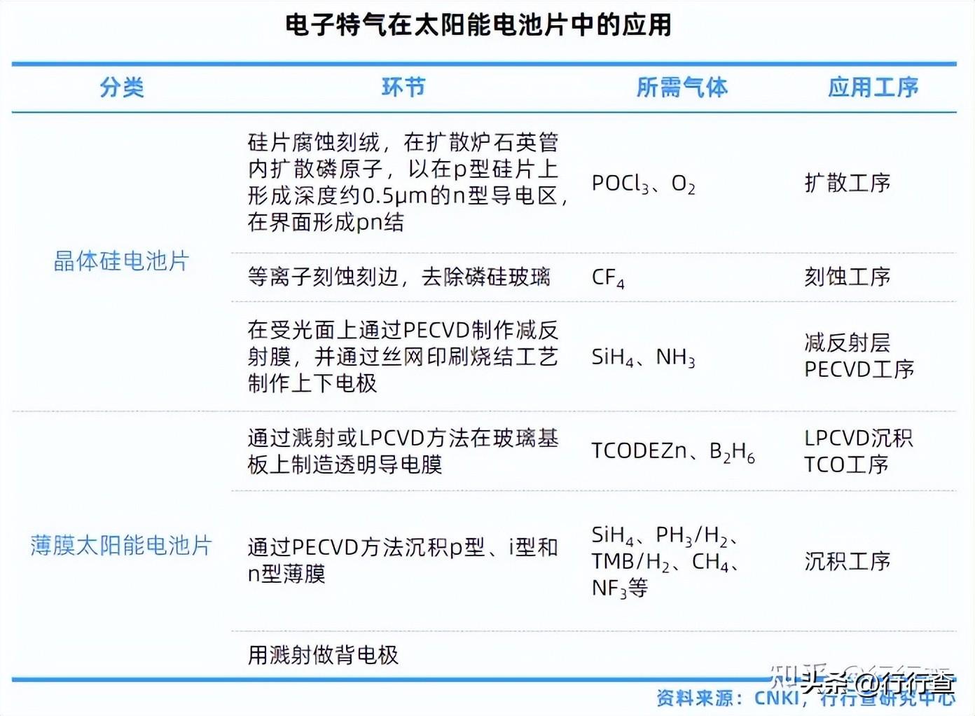 太阳能电池是一种利用太阳光直接发电的光电半导体薄片,由于太阳能是可再生的清洁能源,太阳能电池具有广阔的发展前景。电池片是太阳能电池的核心组件,目前,主流的太阳能电池片分为晶体硅电池片和薄膜太阳能电池片。电子特气在二者的生产过程中均扮演着重要角色。