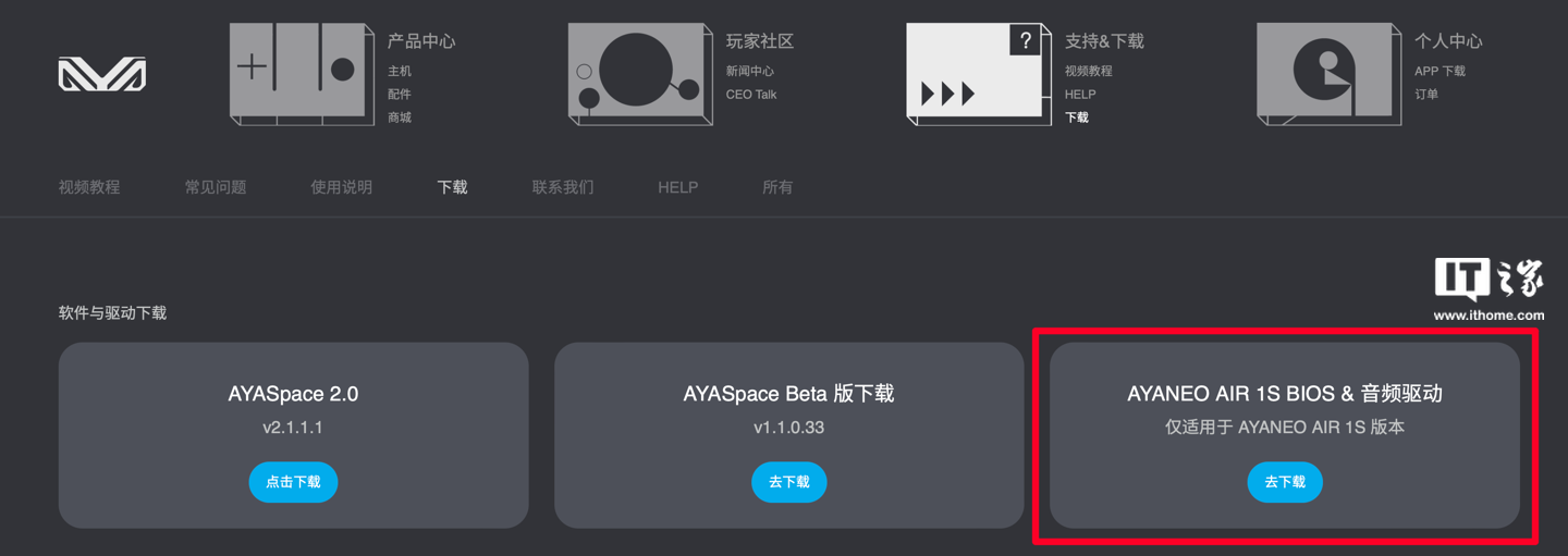 IT之家查询 AYANEO 官网获悉,AYANEO AIR 1S 掌机的新版 BIOS 与音频驱动已经上线。