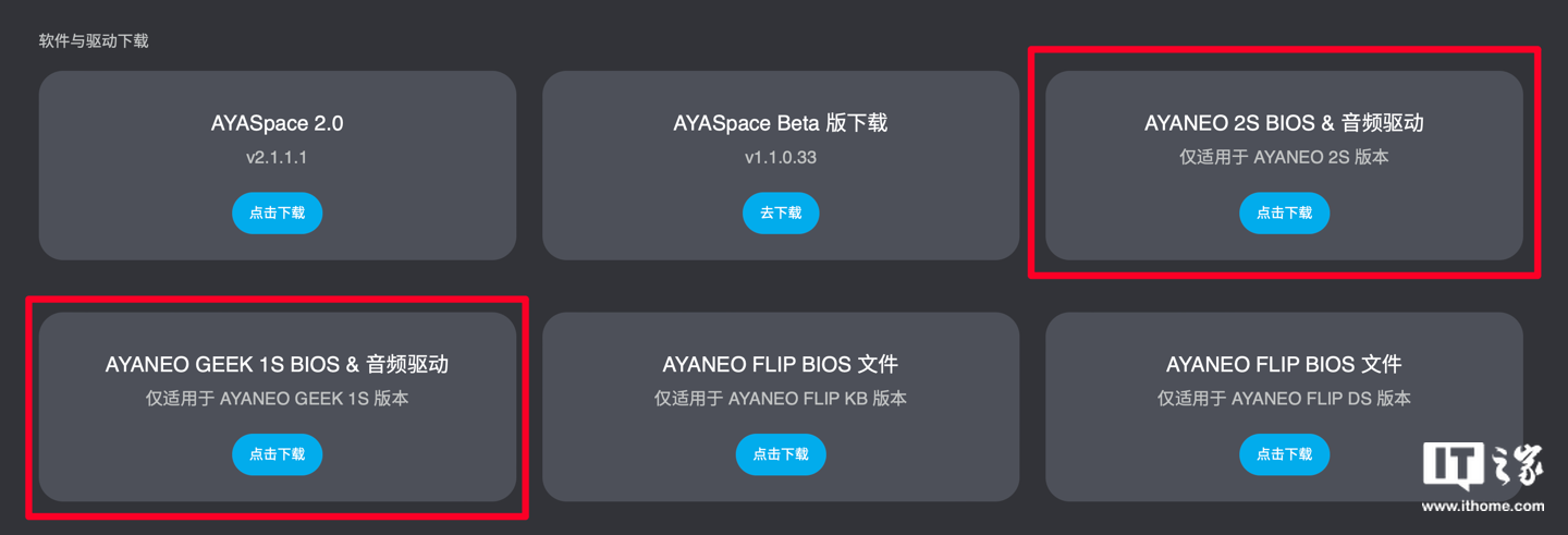 IT之家查询 AYANEO 官网获悉,两台掌机的新版 BIOS 与音频驱动已经上线官网下载中心。