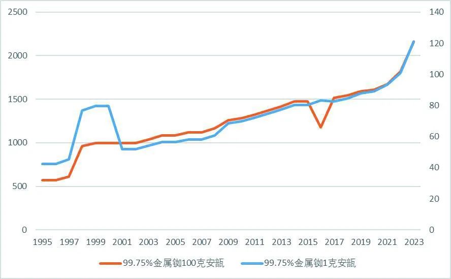 过去30年,铷价格总体波动上涨了3倍左右。美国地质调查局显示,两种不同单位金属铷的价格走势大体相似。1997年,1克安瓿金属铷的价格由45.4美元快速上涨至76.6美元,此后4年维持相近水平,在2001年快速下降至52美元后缓慢反弹,至2015年超过前期高点。2023年,同比快速上涨20%至121美元。100克安瓿金属铷的整体价格走势与1克安瓿总体相似,但在部分年份存在价格偏离的情况,如在2015年-2017年,100克安瓿金属铷价格阶段性调整,1克安瓿金属铷价格却稳步上涨。