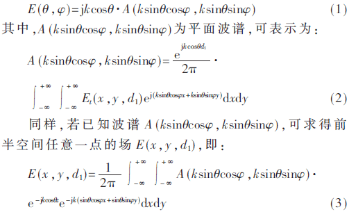 在笛卡尔坐标系中,如图1所示,将待测天线口径面置于xoy平面上,在z=d1设置一个扫描平面,且扫描平面上的切向场分布为Et(x,y,d1),则天线的远场方向图函数在球坐标系下可以表示为[15-16]: