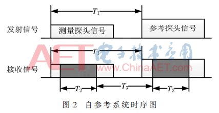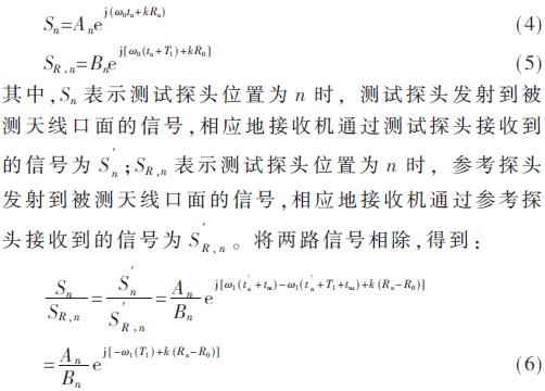 设测试探头与被测天线的空间距离为Rn,n=1,2,3,…,N。参考探头与被测天线的空间距离为R0,信号角频率为ω0,信号发射起始时刻为tn,测试信号起始时刻与参考信号起始时刻时间间隔为T1,k为ω0频率下的空间波数,An为测试探头位置为n时测试探头发射到被测天线的幅度信息,Bn为测试探头位置为n时参考探头发射到被测天线的幅度信息,根据图1所示时序,测试探头到达到天线的信号为:
