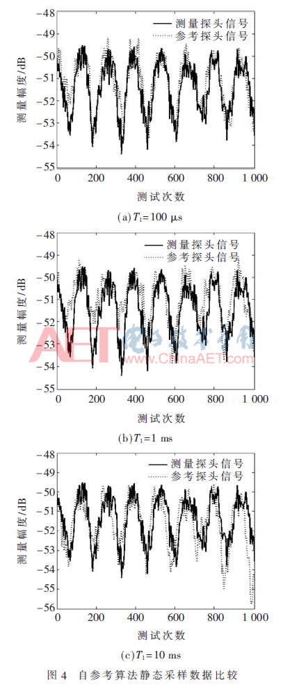 首先,控制近场扫描架,使测量探头对齐辅助天线(AUT)中心,在该位置下进行静态采样,以验证自参考算法公式(3)的正确性。对PC记录下的3组参考探头和测量探头的测试数据进行分析,每组数据为1 000个,T1分别取100 μs、1 ms和10 ms,将测量探头测试数据与参考探头测试数据相除,得到结果如图4所示。