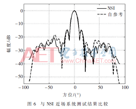 将采用NSI近场测试系统得到的远场二维方向图与采用自参考算法得到的远场二维方向图进行比较,其比较结果如图6所示。