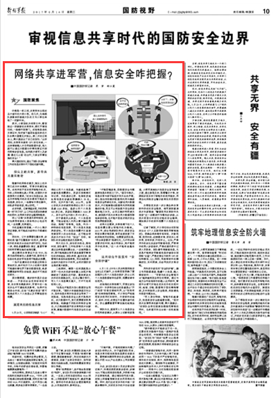 仿佛是一夜之间,共享单车出现在各大城市的大街小巷。众所周知,共享单车装有GPS定位系统,一旦终端被植入木马导致数据失窃,他人就可以通过大数据分析得知营区内部布局等涉密信息。如何既方便军人及家属“最近几公里”的出行,又保证军事设施的安全?今日出版的《解放军报》探讨了部队安全管理工作在信息共享时代下面临的新问题。