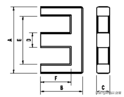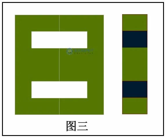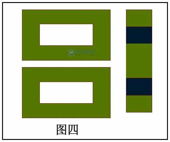我们看下图三EE行的磁芯的平面图,中柱部分的面积要比两边的大,其实我们要是吧中柱部分切开来的话,就会变成了图四一个样的磁芯,从图四可以看出EE形磁芯,其实就是两个闭合长方形的磁芯结合在一起。