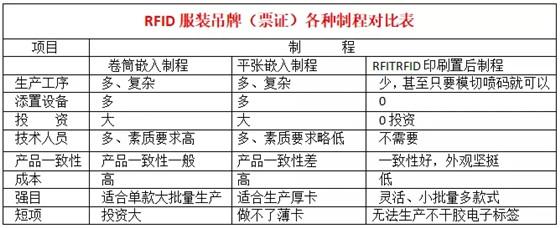 传统上RFID服装吊牌生产制程主流为两种制造工序。第一种制程为卷筒式嵌入贴标,生产步骤为:卷筒纸印刷,然后天线芯片贴标,最后复合模切。这种复合设备进口的有纽豹、妙莎、必诺等,国产也有价格略微便宜但性能不稳定,国产价格也在人民币200万以上。这种制造工艺的优点生产速度快,缺点是投资大、适合大批量订单、小批量调机浪费巨大而且不适合做太厚的纸卡票证。传统印刷企业如果有了长期大量稳定订单可以考虑购买这类设备。