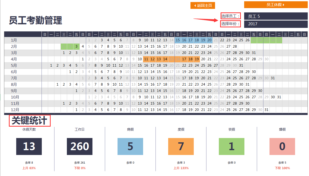 至此考勤表设计完成,可以实现用Excel函数自动统计指定年月考勤。