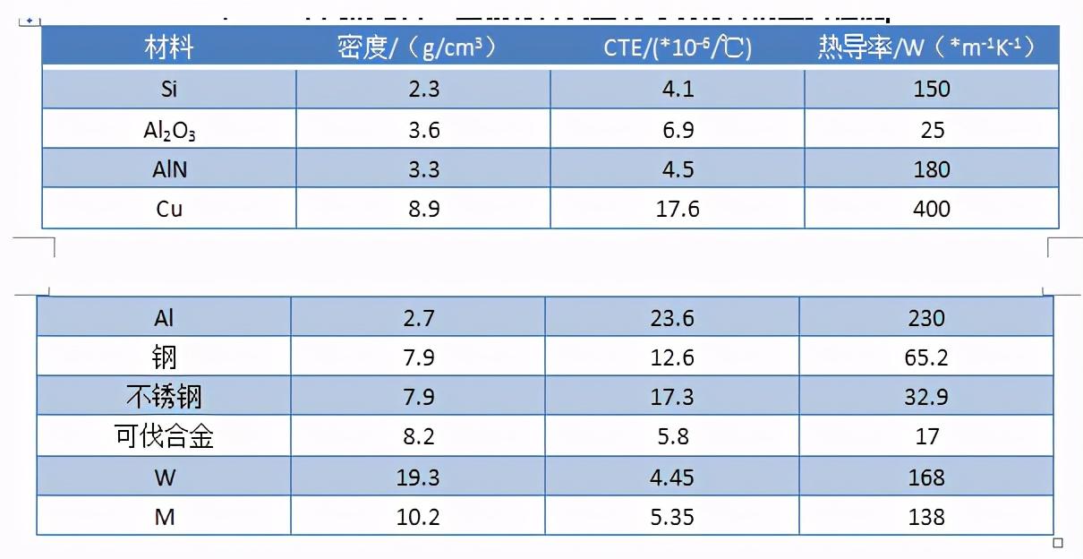 常用的芯片、基板材料及金属封装材料的主要性能
