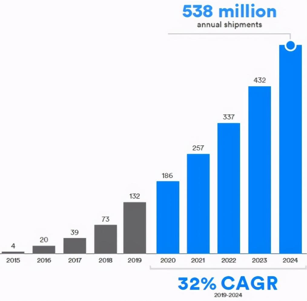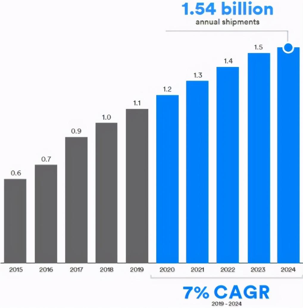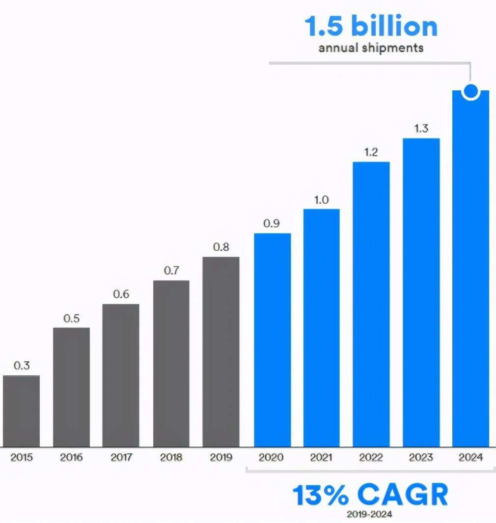 ● 数据传输应用包括:运动健身体征数据测量、医疗保健、输入和控制、物联网等。2019-2024年增长率为13%,到2024年出货量将达15亿个。