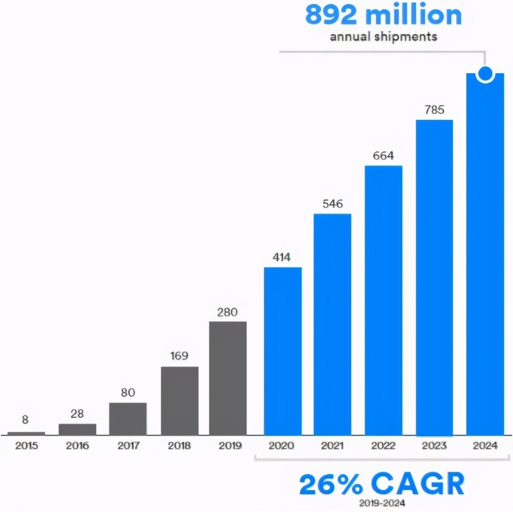 根据蓝牙技术联盟的最新2020蓝牙市场报告,到2024年蓝牙设备年出货量将达到62亿个,2019-2024期间的年复合增长率为8%。具有测向功能的电池供电蓝牙设备将成为未来5年的市场亮点,可以支持这些功能需求的蓝牙射频芯片将具有巨大的增长空间。 一个明显的趋势是,低功耗蓝牙技术正在成为新的市场标准,支持ble蓝牙芯片和设备增长最快,增长率高达26%。从2020年到2024年,预期BLE单模设备累积出货量将达到75亿个。