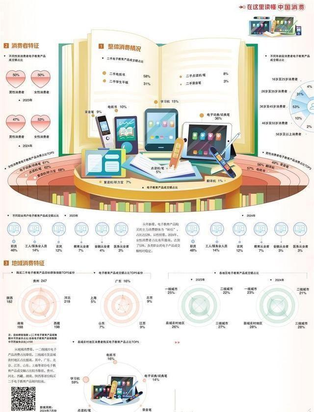 伴随着循环经济理念的深入人心,二手电子教育产品的销售也呈现出较快的增长趋势。其中,二手电纸书的占比最高,达58%。从地区来看,贵州、河北、西藏等地的消费者更青睐购买二手电子教育产品。这不仅体现了消费者的环保意识,也缓解了不少家庭的经济压力。