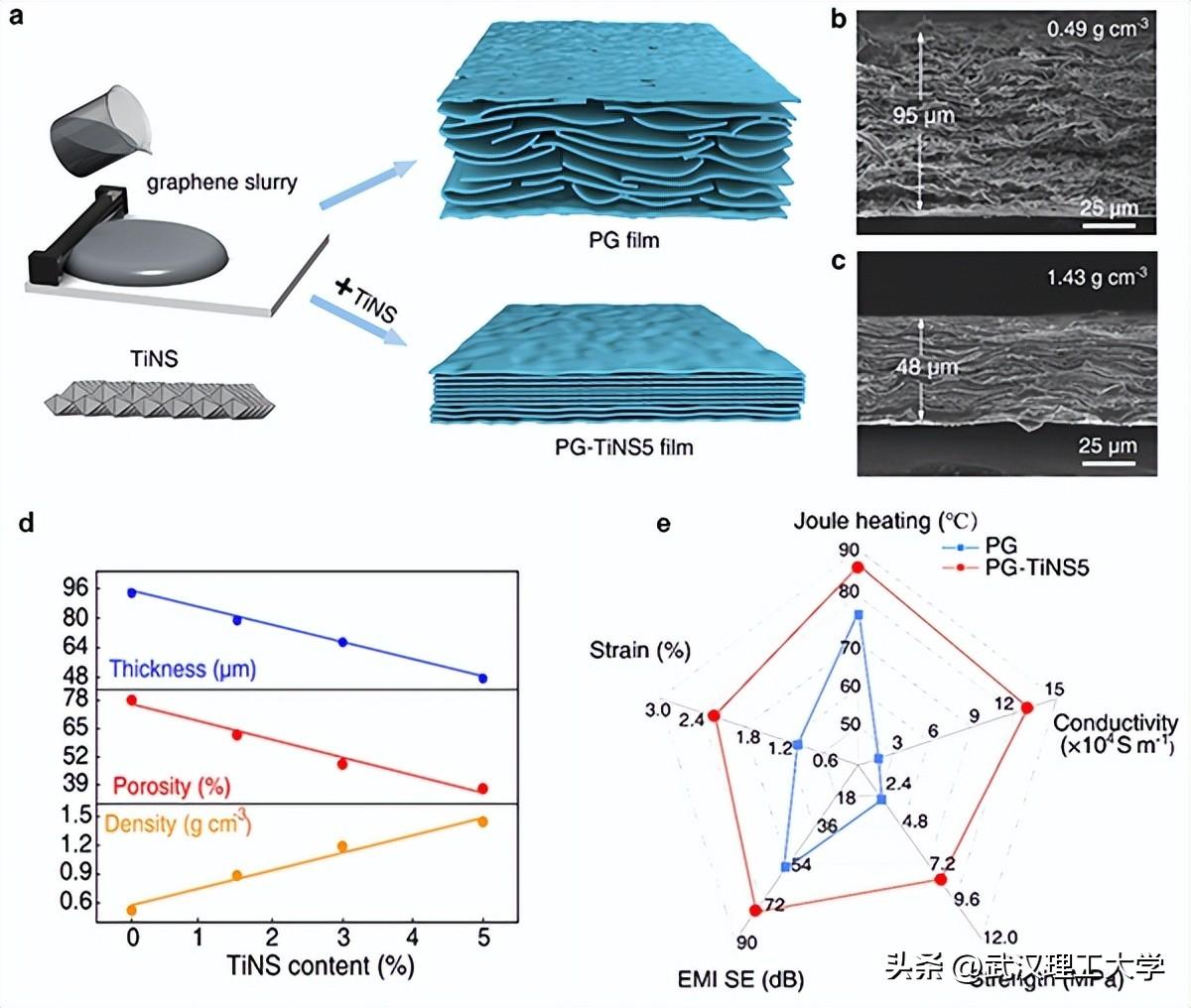 基于团队前期石墨烯与二维纳米材料(MOF纳米片、Mxene等)(ACS Nano, 2022, 16, 3934;iScience, 2022, 25, 105001)相互作用研究的基础上,本研究工作提出利用二维材料之间静电排斥对齐效应,通过在原始石墨烯(PG)前驱体中添加微量的高电负性二氧化钛纳米片(TiNS),实现了高度有序且致密的宏观石墨烯膜制备。研究表明,二氧化钛纳米片的高电负性改善了石墨烯浆料的分散性,从而促进了石墨烯纳米片的有序自组装。与纯石墨烯浆料组装的宏观膜相比,优化制备的宏观石墨烯膜内部微观结构缺陷显著减少,堆叠组装的石墨烯片层的取向性显著提升,使宏观石墨烯膜的各向综合性能显著提高。其中,电导率提高了近一个数量级(达到1.285×105S/m),拉伸强度提高近4倍,同时展示出优异的柔性(耐弯折超5000次)。