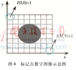 为了算法识别的方便,标识点一般设计为特定的形状。圆形标记点是一种常用的标记点,一般可以通过边界识别得到圆周上的点,再通过拟合求出圆心坐标。本文采用一种特殊的标记点识别方法,即灰度重心算法。灰度重心算法是将数字图像像素的灰度看作是数字图像的“密度”,认为图像中一个斑点的中心位于其“重心”处。相应地,对于一幅大小为M×N的灰度图像区域,如图4所示,设其每个像素的灰度值为I(i,j),(0<i<m,0<j<n),可以定义标记点的灰度重心坐标为: