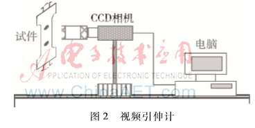 随着光电技术的发展以及光电产品的普及,基于最近发展起来的激光干涉引伸计、CCD相机图像采集以及数字图像分析的视频引伸计[1-3]得到越来越多的应用。视频引伸计如图2所示,它通过拍摄试件表面的图像,利用图像分析算法分析图像中标志点之间的变形来测量试件表面的应变。视频引伸计为非接触测量,因此可测量柔性试件,可在恶劣环境下测量,而且也可以测量微小试件和大变形,因此在新材料、新技术领域受到越来越多的重视。但与传统的电阻式引伸计相比,专业视频引伸计的价格相当昂贵,光照要求严格。这在一定程度上限制了视频引伸计的应用。