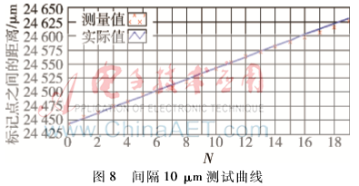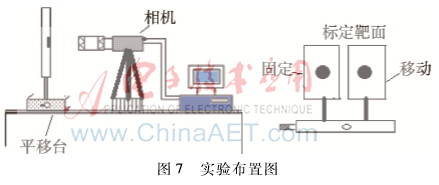 在系统搭建完成后,需要确定系统测量的分辨率,由应变的定义可知,应变为试件的相对变形,因此此引伸计的分辨率可以通过两标记点之间位移的变化来测得,标定实验装置如图7所示。
