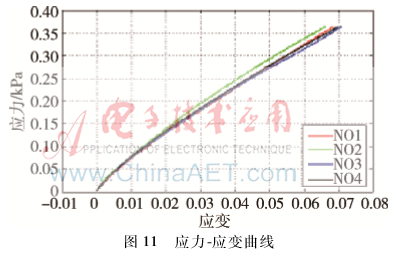 用橡皮制作4个相同的试件,在试件上做两个标记点,如图10所示,将试件夹持在MTS试验机上做拉伸试验,用引伸计实时记录试件的应变。配合试验机的相关数据,得到图11所示的4组应力应变曲线。 由图11可看出这4组应力应变曲线拥有较好的重合度,且本文所开发的引伸计所测的最大应变值可高达0.1。