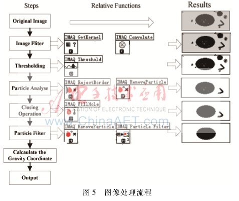 本系统中图像处理程序流程及在LabVIEW中实现相关操作的函数和处理效果如图5所示。第一步先对原始图像进行滤波和增强操作。在LabVIEW的VISION模块[9-10]中,提供了多种滤波算法,包括线性滤波法和非线性滤波法,有针对空域的和针对频域的滤波方法,也有频率域滤波法。可根据实际所采集的图像设置合理的滤波参数。经过多次实验,发现该系统采用有平滑作用的卷积滤波法,能够得到非常好的结果,因此决定图像处理中第一步先对图像进行卷积滤波操作。滤波完成后接着对图像实施二值化[11-12]操作。二值化操作是为了最大程度地增强标记点与背景图像的对比度。图像经过二值化分割后,不可避免地存在一些与检测对象像素值相似的干扰点或区域,这些点或区域需要在计算之前去除掉。在LabVIEW中可采取闭区域面积筛选的方法,即在图像处理中只保留与标记点面积大小相似的区域,与标记点面积相差较大的区域将予以剔除。因此只要在系统中设置合理的面积筛选区间,标记点便能正确提取出来。由于受到光照变化和相机内部噪声的影响,所提取的标记点图像会出现一些不规则的噪声点,这些噪声点将会对计算灰度重心有较大的影响。因此需要在计算灰度重心之前予以消除。一个可行的办法是对图像进行闭运算[13-15]。闭运算可以填平轮廓中细小的孔,弥合轮廓上的小缺口,而且目标特征的总的位置和形状不变。经过上述处理后,标记点图像变为一个纯净的、完全连通的、对比明显的二值化图像。用LabVIEW实现式(1)的计算后,可得标记点的坐标。