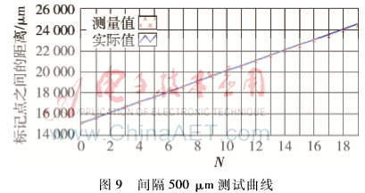 调节相机的放大倍率,使得一个像素相当于40 μm,将平移台移动间隔分别取10 μm、500 μm,分别移动20次,系统所计算的结果与实际值的对比曲线如图8和图9所示。