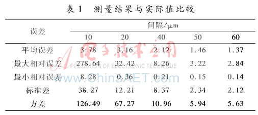制作包含标记点的平板,其中一个固定,另一个可随精密平移台移动。平移台移动时两个标记的距离会发生变化,以此来模拟试件的拉伸实验。调节相机的放大倍率,使得一个像素相当于1 mm。将平移台移动间隔分别取10 μm、20 μm、40 μm、50 μm、60 μm(换算为图像分辨率为0.01、0.02、0.04、0.05和0.06像素)。对于每种移动间隔,分别移动精密平移台20次。将测量的结果与实际值相比较,其结果如表1所示。