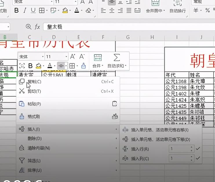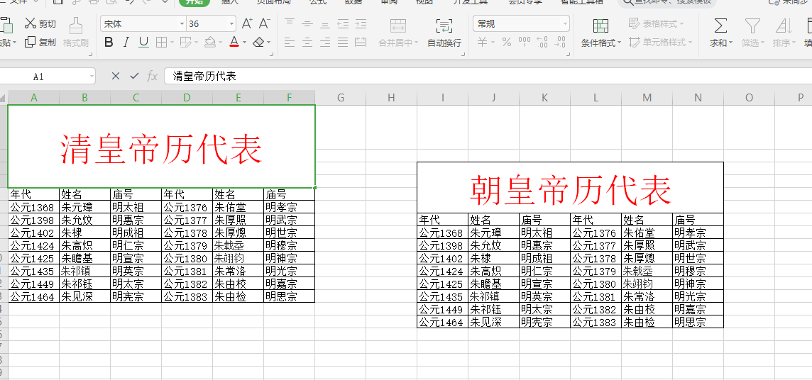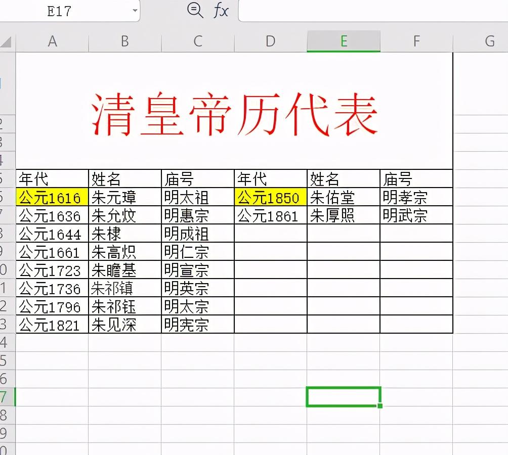 大家好这一节课我们学习excel表格办公软件快速修改表格,我们根据上一节课的表格来快速修改表格,我们利用简单快捷省时省力的方法制作出更多的表格,明朝皇帝历代表,只要修改一个明,就成为表格的标题了。