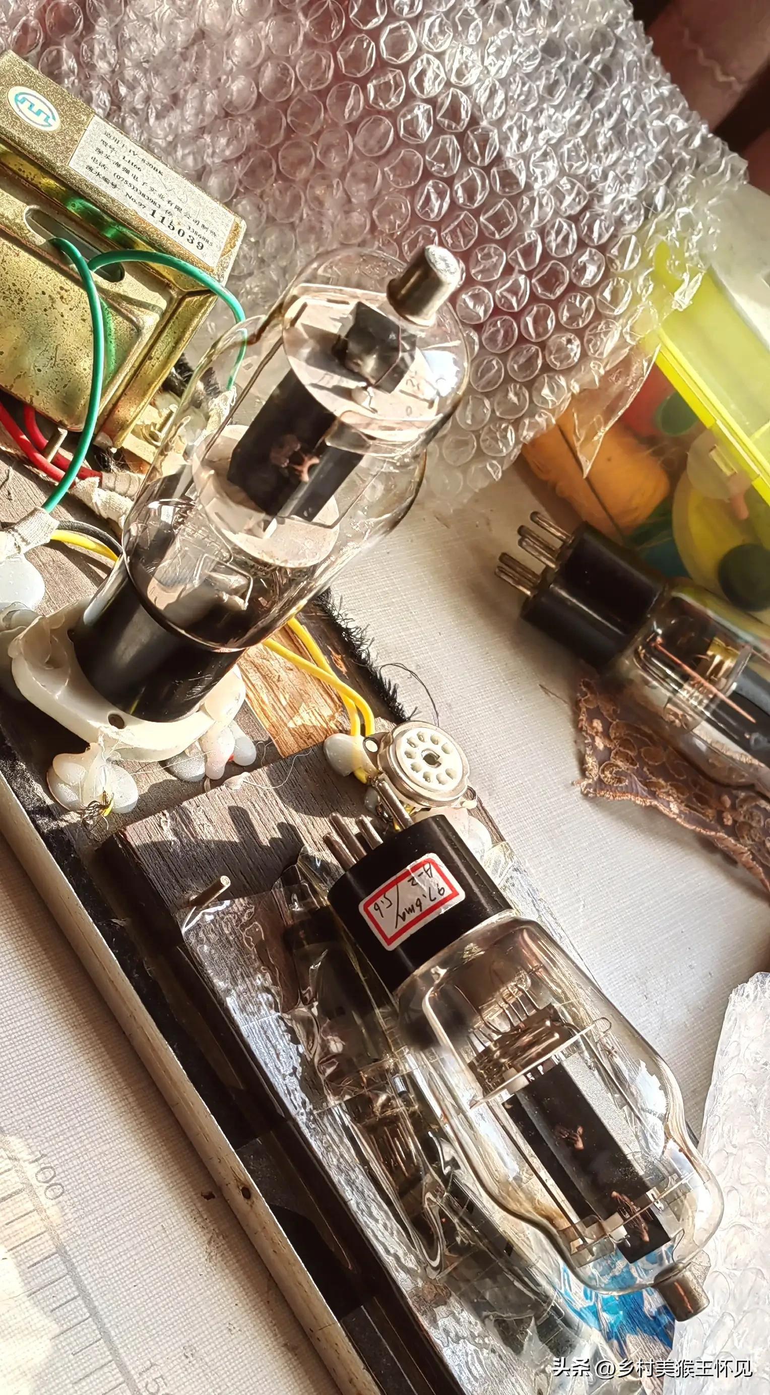 各种各样的电子管,插在只有灯丝的管座上,测试每个电子管的参数。自己改装的电源变压器输出6.3v灯丝电压供各种电子管测试用。