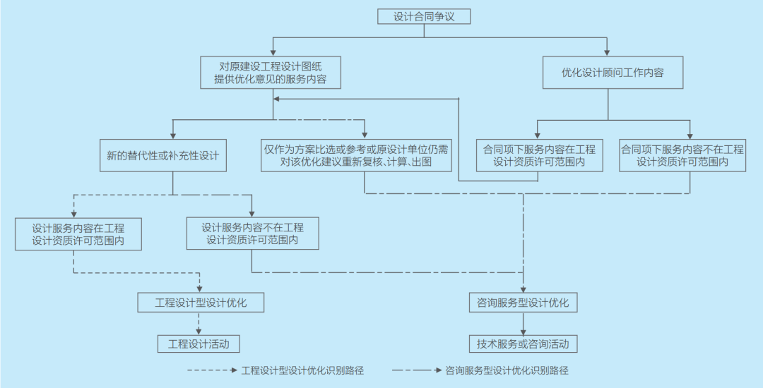 工程设计范围包括本行业建设工程项目的主体工程和配套工程以及与主体工程、配套工程相关的工艺、土木、建筑、环保、水土保持、消防、安全、卫生、节能、防雷、抗震、照明工程等设计,因此可以通过合同项下所包含的服务内容是否属于工程设计资质许可范围内的设计来识别设计优化的具体类型。比如,对于某些特定设备选型设计优化、地块前期商业顾问优化服务(如前期市场调研、定位策划、MD规划策定或基本规划业务等)、某些特定系统参数设计优化等,显然不在工程设计资质许可范围内,故可认定为咨询服务型设计优化,一般在合同性质上可认定为技术咨询合同或技术服务合同。而对于合同项下服务内容在工程设计资质许可范围内的设计,一般被认定为工程设计型设计优化。例如,山东省德州地区(市)中级人民法院(2020)鲁14民终1698号认为:“合同项下设计优化顾问工作的内容包括方案优化设计顾问、外立面深化设计顾问、施工图设计指导以及外立面指导服务。平面优化设计顾问工作(重要节点设计);顾客配置升级区域;物流动线配置升级区域;停车场流线优化设计,停车场出入口/车位/车流动线等区域优化设计;立面优化设计顾问工作;在原有方案基础上进行优化设计,充分考虑现有外墙立面、外立面玻璃幕墙及铝板幕墙、空调机组、给排水、燃气、厨房配套、外立面亮化、外走廊空间装饰及景观设计衔接等;店招和广告位的深化设计工作。根据《建设工程勘察设计资质管理规定》第三条规定,凡从事工程勘察、工程设计活动的单位,必须取得资质证书,方可开展工程勘察或工程设计业务。这里的工程设计,根据该管理规定,是指依据工程建设目标,运用工程技术和经济方法,对建设工程的工艺、土木、建筑、公用、环境等系统进行综合策划、论证、编制建设所需要的设计文件及其相关的活动。本案景观设计合同是对建筑工程的环境等进行系统规划设计,按照上述规定,应当具有相应的资质。”由此可见,通过合同项下所包含的服务内容是否属于工程设计资质许可范围内的设计来识别设计优化的具体类型,具有一定的实务参考价值。