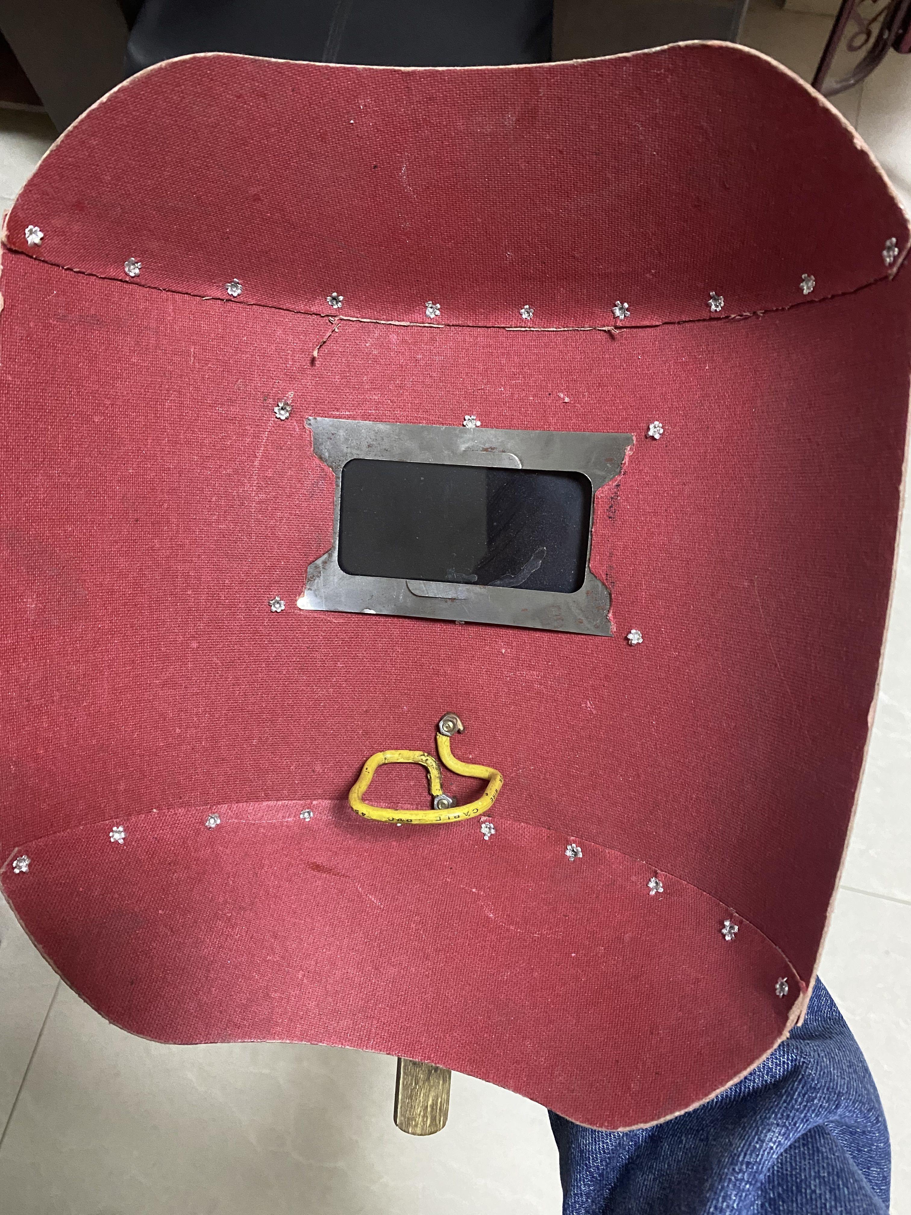 左手受伤后,卢仁峰在焊帽里加了一段铁丝。新京报记者 乔迟 摄