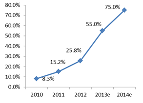 艾瑞咨询数据显示,2013年中国智能手机的保有量为5.8亿台,同比增长60.3%,智能机价格不断走低,不断向三、四线城市渗透,这将进一步加速移动互联网生态环境的演进。