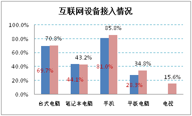 2014年,台式机、笔记本等传统上网设备的使用率保持平稳,移动上网设备的使用率进一步增长,新兴家庭娱乐终端网络电视的使用率达到一定比例。