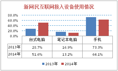 根据CNNIC中国互联网络发展状况统计调查数据显示,2014年新网民最主要的上网设备是手机,使用率为64.1%。