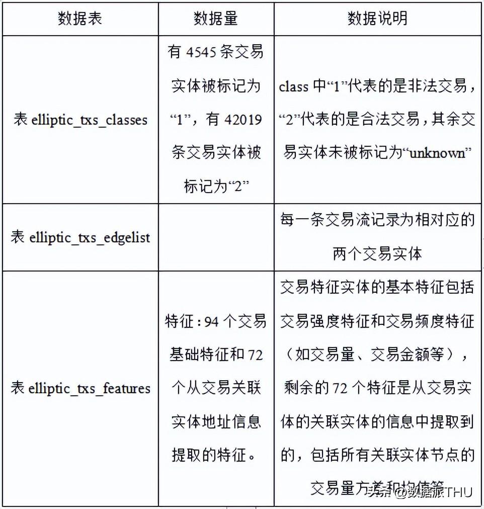 我们从Kaggle上选取了区块链情报公司Elliptic公开发布的比特币交易网络数据集。其中在这些交易数据中,节点表示比特币交易中的实体,边表示比特币交易实体间的交易关系和方式,该交易网络数据集一共分为三个数据表,如下表2所示各个表的数据说明。
