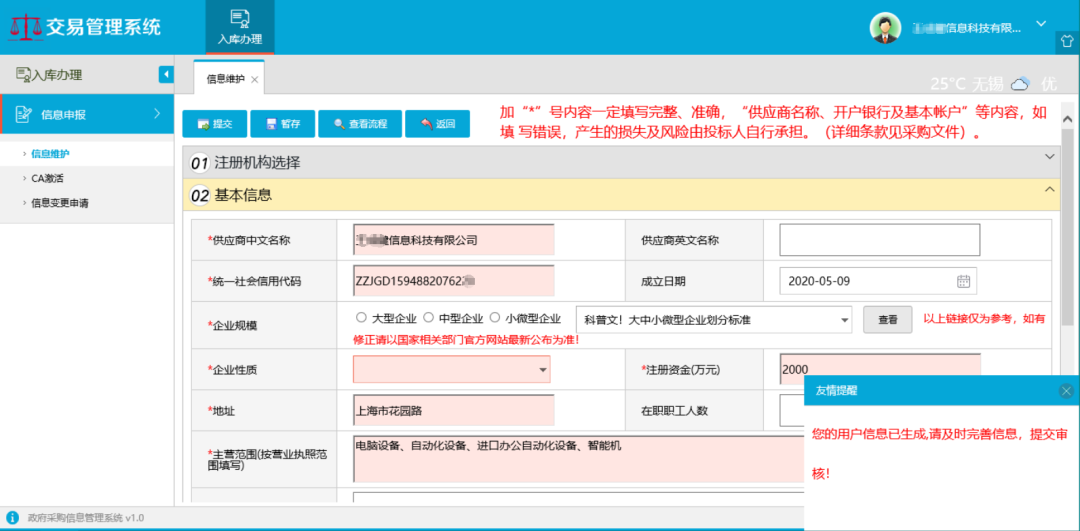 完善供应商入库信息,在线调取电子营业执照相关信息资料数据,自动匹配政府采购供应商入库信息,减少人工录入,重复录入,提高了数据资料的完整性和准确性。