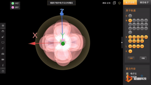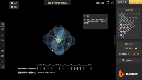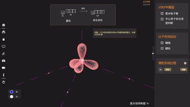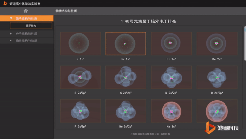 高中化学VR/3D虚拟仿真实验室中的“物质结构与性质”新模块,提供了1-40号原子的结构与性质,将常规教学中难以观察的原子的空间微观可视化,抽象晦涩的化学概念原理模型化、过程化。例如,老师在讲授电子云模型、轨道能级和形状时可打开“物质结构与性质”软件辅助形象生动地完成教学过程,更好地了解电子云的形状、各层电子轨道间的关系。