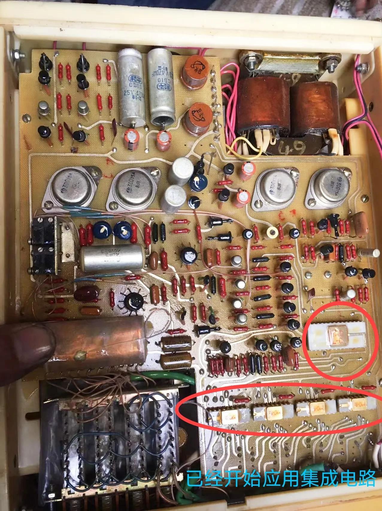 机器的另一面:金封大功率三极管以及右下角红圈标内集成电路的应用!