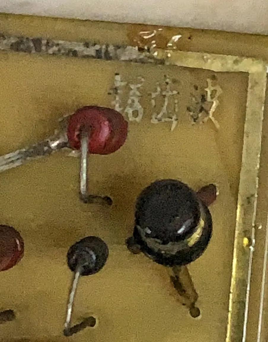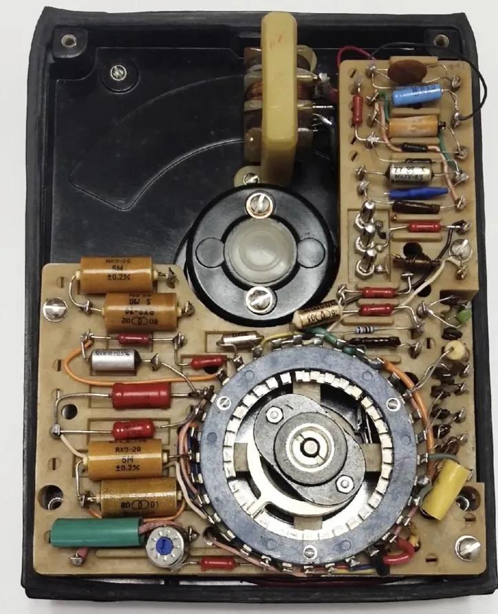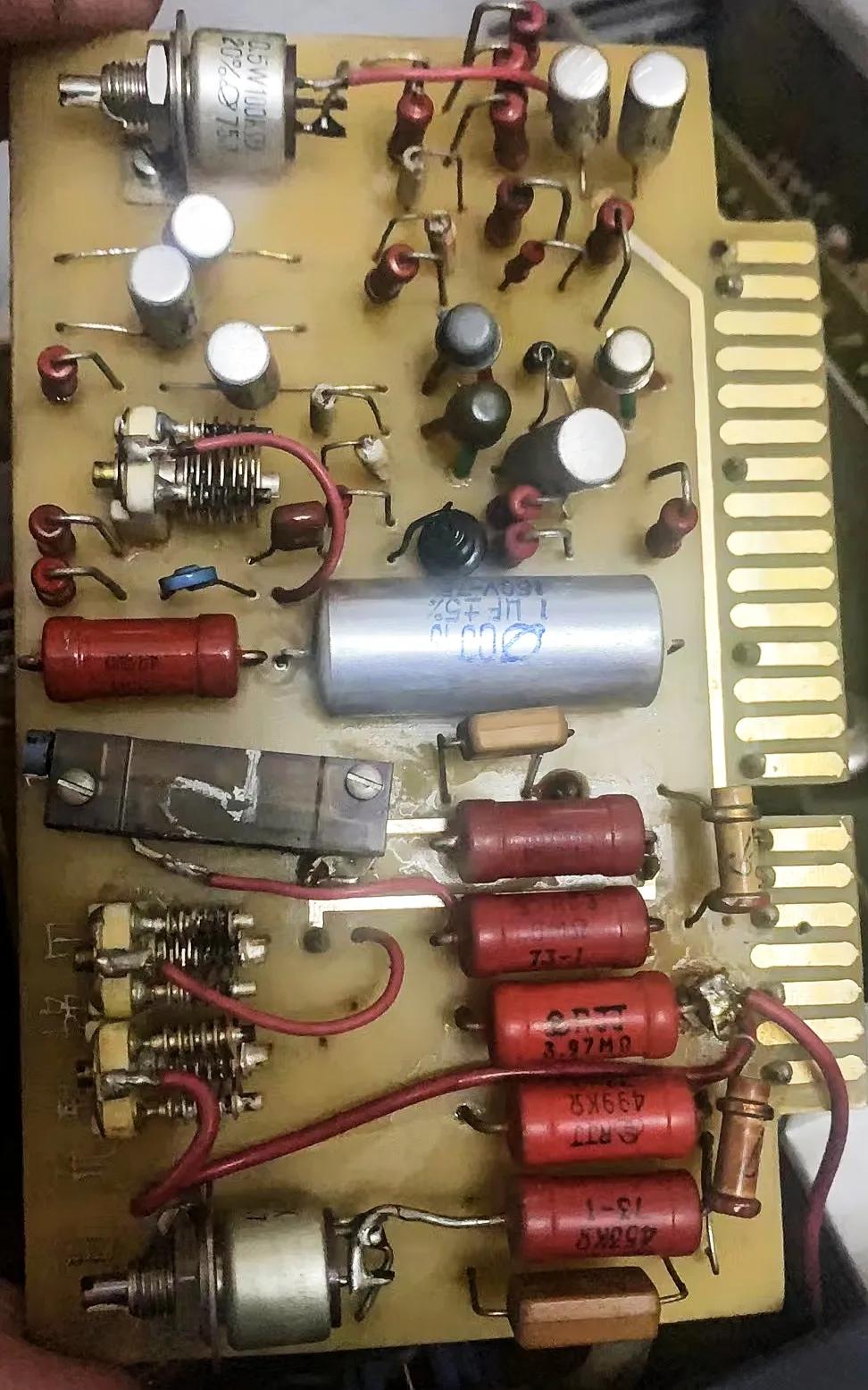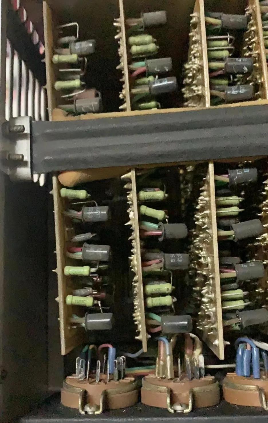 部分插板细节,内部由很多可调元件组成用来调试万用表的精度和误差。大红袍电阻、轴向电容、瓷管电容、云母电容……