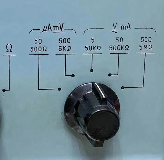 左侧细节:最左侧分别为接线柱,电源开关、量程选择、档位调零等。