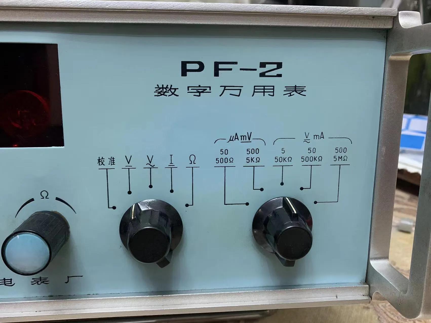 近一点看我们能看到面板写着机器型号:PF-2。产品品类:数字万用表。右侧为欧姆调零电位器和各手动档位机械开关。