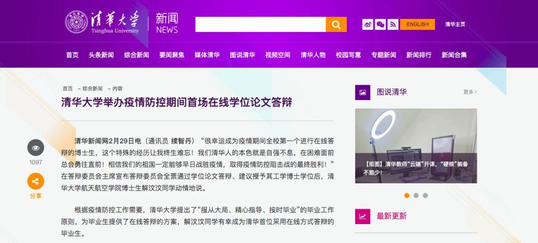 2月27日,清华大学举办疫情防控期间首场在线学位论文答辩。
