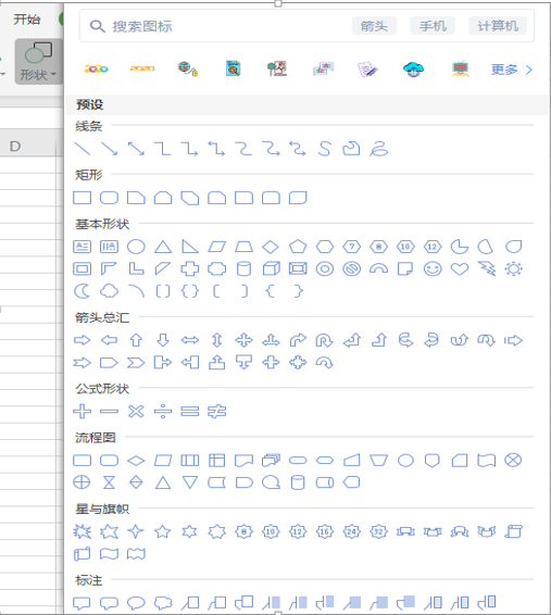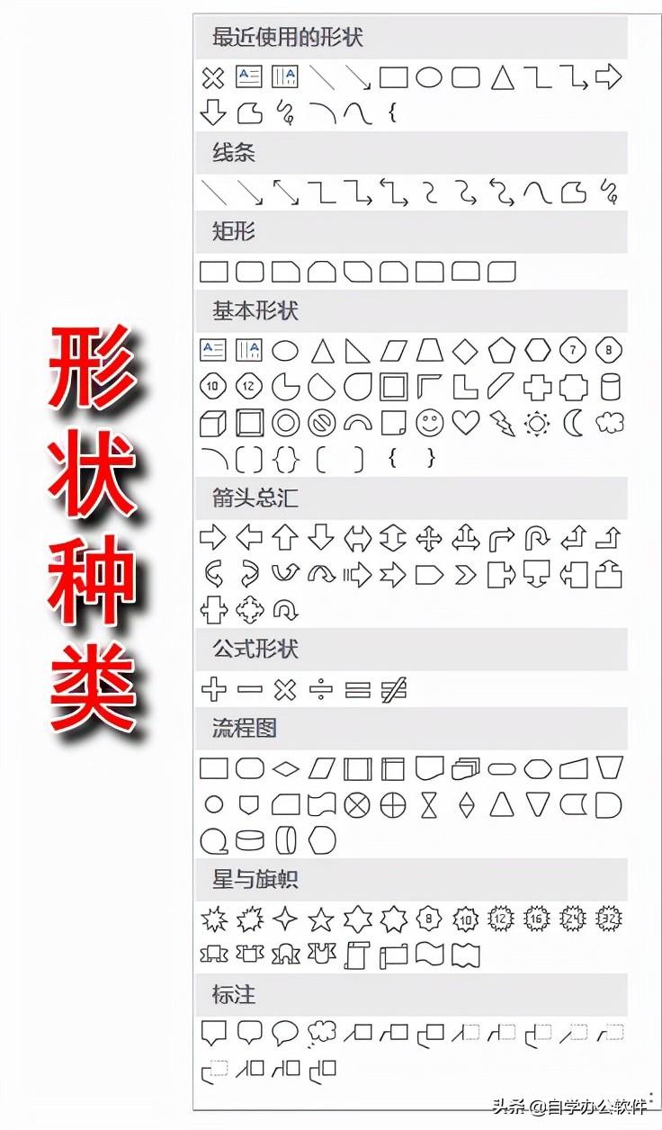 形状包括线条、矩形、基本形状(包括文本框)、箭头、公式形状、流程图、星与旗帜、标注8大类。