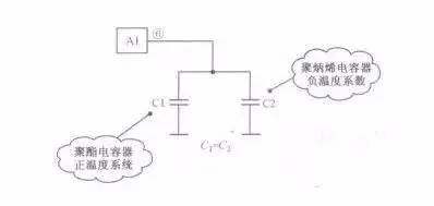 当工作温度升高时,Cl的容量在增大,而C2的容量在减小,两只电容并联后的总容量为两只电容容量之和,由于一个容量在增大而另一个在减小,所以总容量基本不变。