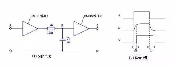 输入信号由低向高跳变时,经过缓冲1后输入RC电路。电容充电的特性使B点的信号并不会跟随输入信号立即跳变,而是有一个逐渐变大的过程。当变大到一定程度时,缓冲2翻转,在输出端得到了一个延迟的由低向高的跳变。