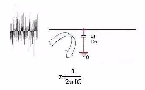 即频率f越大,电容的阻抗Z越小。当低频时,电容C由于阻抗Z比较大,有用信号可以顺利通过;当高频时,电容C由于阻抗Z已经很小了,相当于把高频噪声短路到GND上去了。
