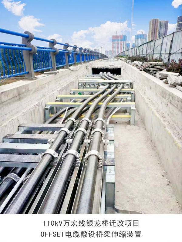 OFFSET可以消除沿桥敷设电缆因桥面移位、弯曲、错位等对电缆产生的过大张力,防止电缆被破坏性拉断或折断。2020年,在广东东莞万宏线银龙桥项目中,沈阳国联成功完成110kV三回1200m㎡高压电缆在桥上四个160mm伸缩缝处OFFSET的设计与施工。