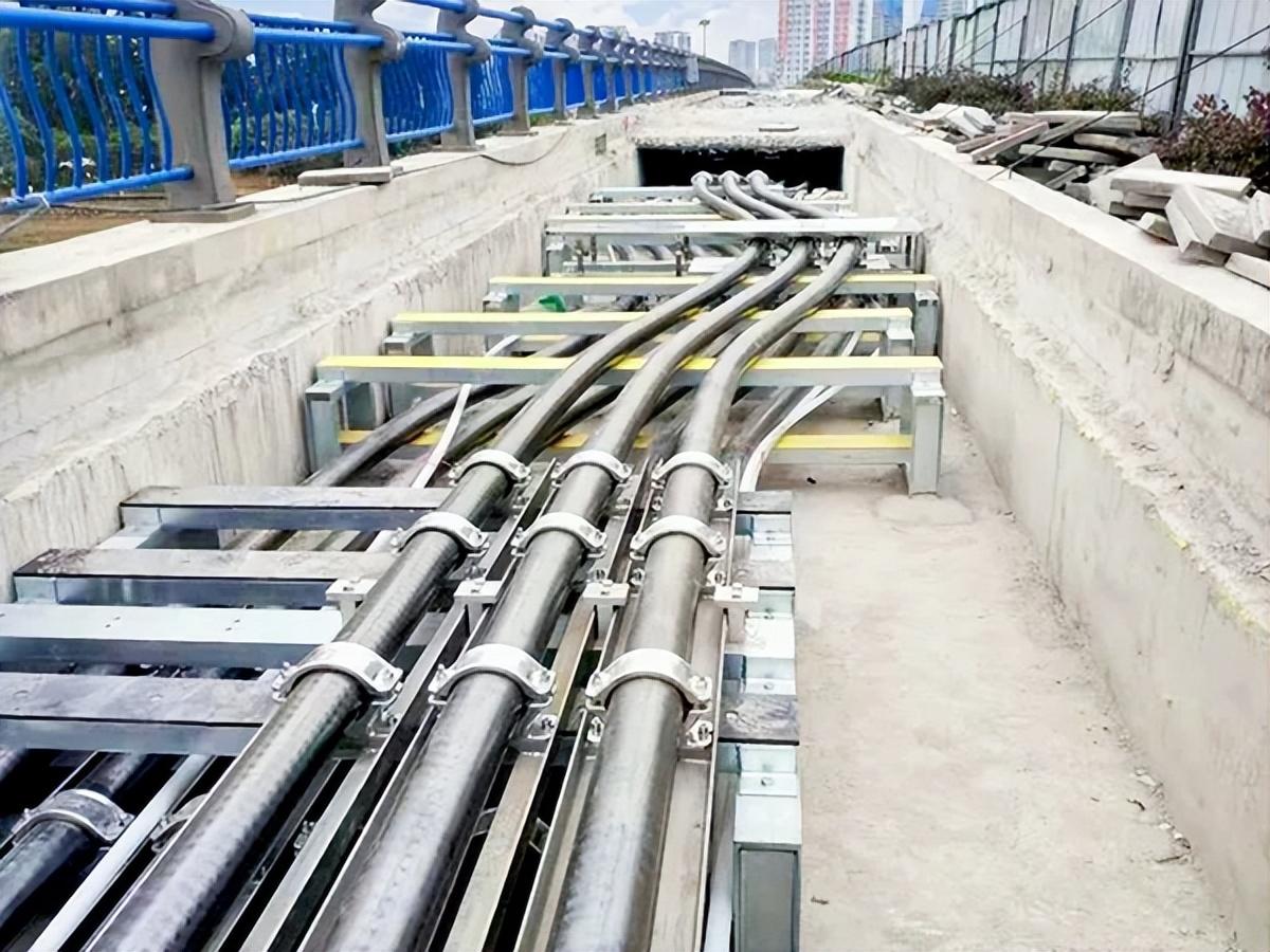 银龙桥横跨万江河,桥梁结构复杂、电缆通道狭窄、设计和施工难度大。沈阳国联从设计到施工验收仅用时半年,解决了窄电缆通道三回双层高压电缆桥梁敷设伸缩补偿的难题。